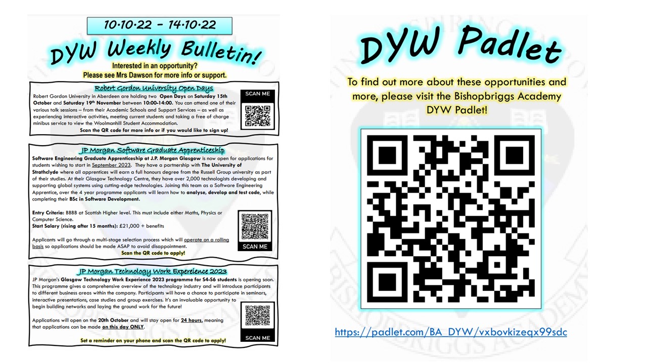 The latest edition of the Developing the Young Workforce bulletin has been published. Please contact Mrs Dawson if you require further information.
